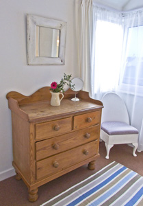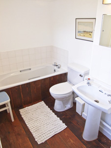 You walk into an open plan living/dining/kitchen area where there is a large Victorian farmhouse, pine dining table, seating 6 comfortably. There is a fully equipped kitchen to the right with all amenities including a dishwasher. Seaviews of course! There is a very large and comfortable 4 seater sofa, and a 2 seater Sofa, a brand new 32 inch Flat Screen Freesat Television and DVD/CD player. There is a new and very efficient Log burner in the original charming brick fireplace plus there is also full central heating in the Beach House - all electricity costs are included in the price. Once again, there are a number of games, books and leaflets about the local area and a pair of binoculars to study the local bird-life or passing ships.