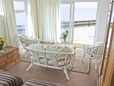 In front of the main living area is the `Sun room` it has windows all around with wooden blinds - extraordinary sea panoramas of course! - two single beds, which also double as seating areas in the day. This room can be closed off from the main living areas by two wooden bi-fold doors. There are occasional tables, and a large scrubbed pine coffee table, plus low lamps.